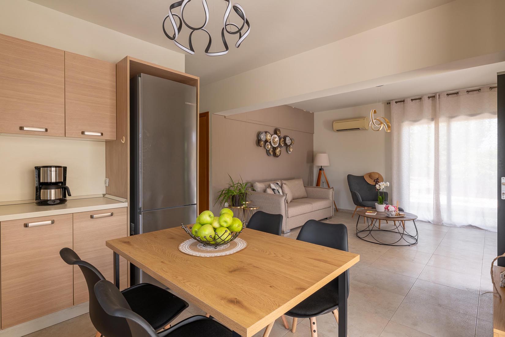 This beautiful house has 2 bedrooms both with a double bed. Also, there’s a comfy double sofa bed in the living room. All bedrooms are fully airconditioned. There is one bathroom with a bathtub for your ultimate relaxation. There’s a fully equipped open plan kitchen for any meal preparation accompanied from the seating area. Also, there’s the spacious and convenient living room in warm colors. The house offers a smart TV as well as a Wi-Fi access.